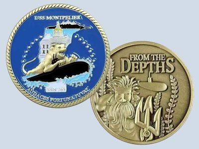A beautiful 1.5 inch brass coin with USS Montpelier SSN 768 patch on the front. The back has the Dolphins and Pride Runs Deep. These coins are designed and only available from me.